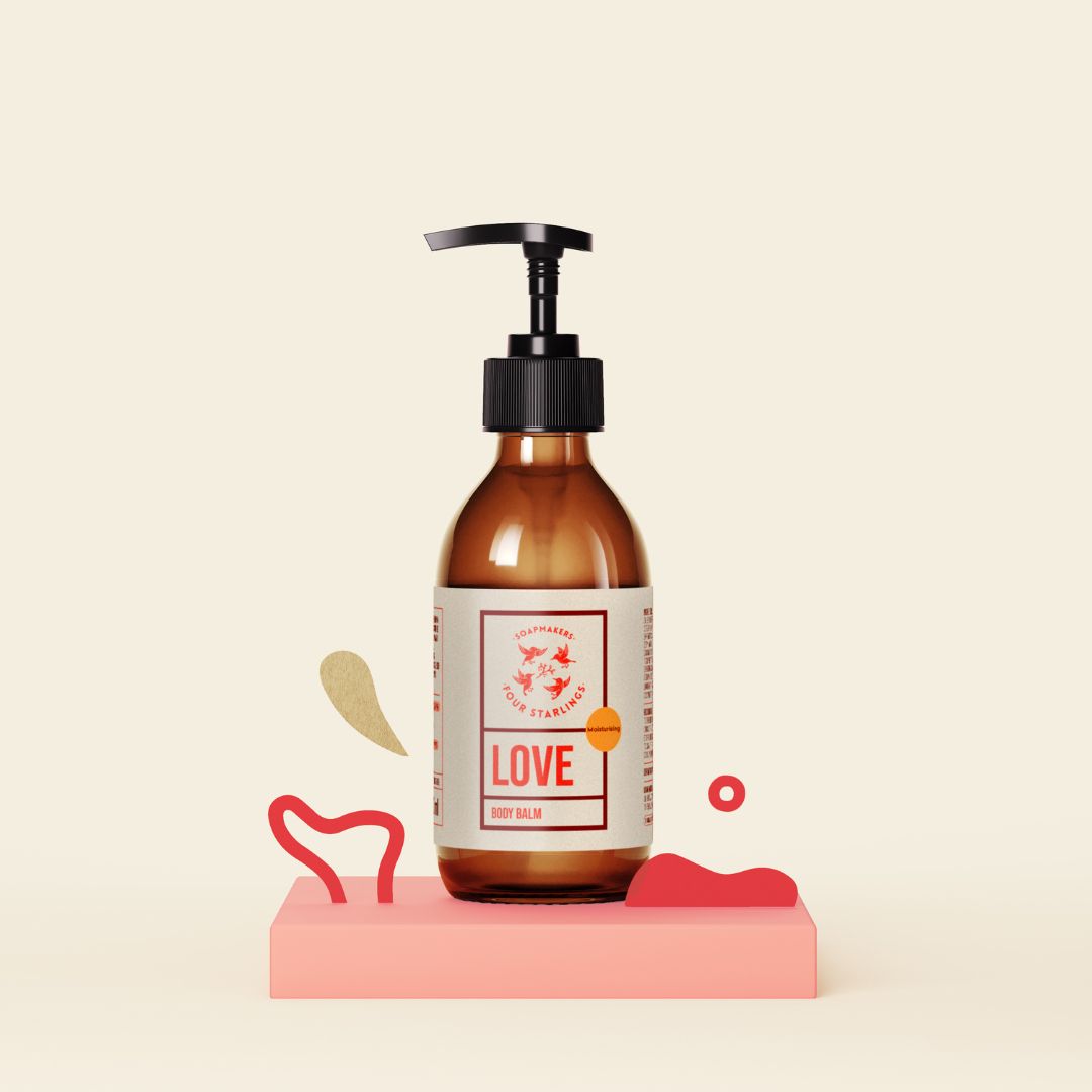 Loción corporal natural “Amor” con manteca de karité, aceite de almendras, aloe y blend cítrico de pachuli, ylang-ylang y pomelo. Deja la piel suave, flexible y perfumada sin sensación grasosa.