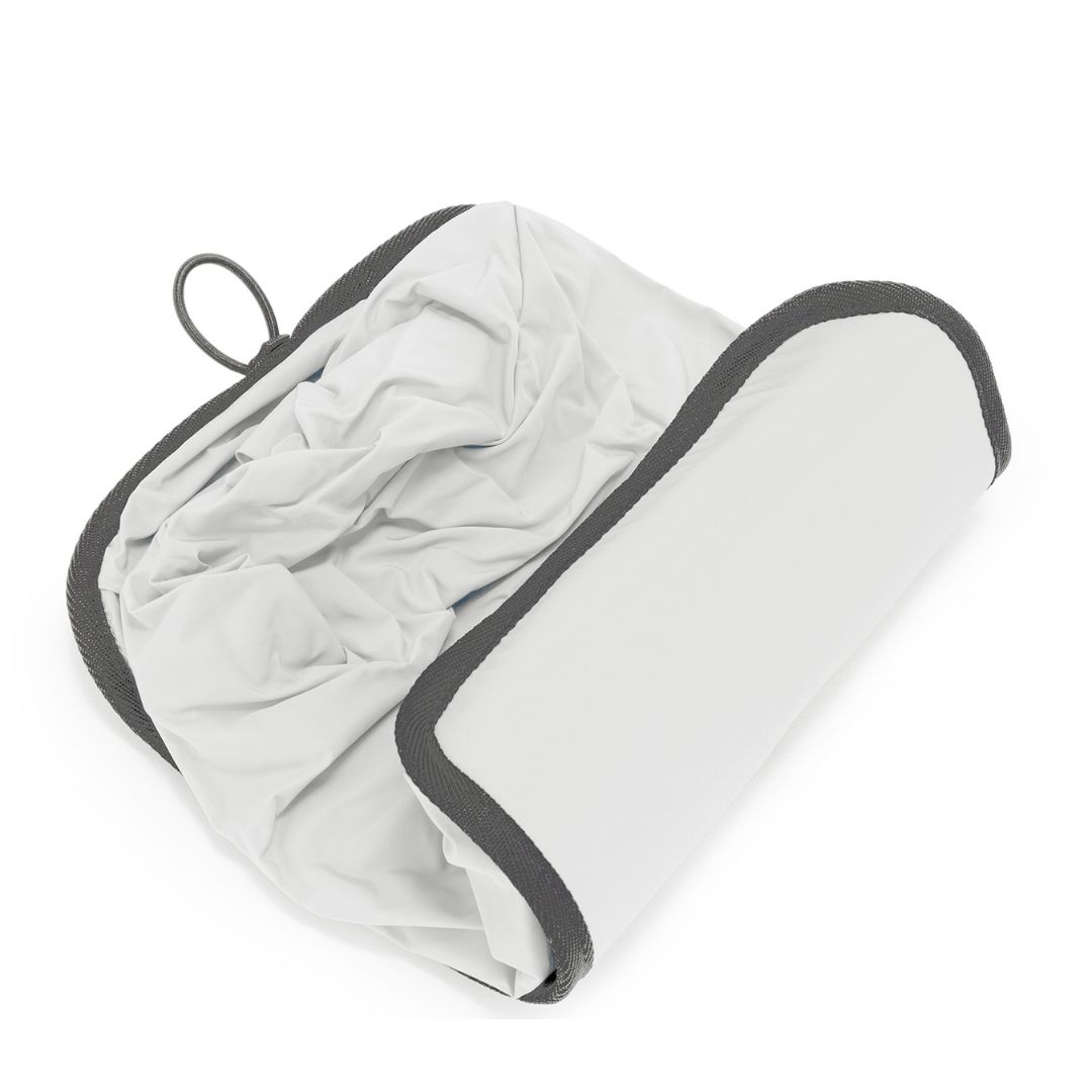 - Tiene un sistema para plegarla en un rollo compacto (goma elástica + botón), para que puedas guardarla fácilmente en tu mochila o bolso hasta volver a usarla.