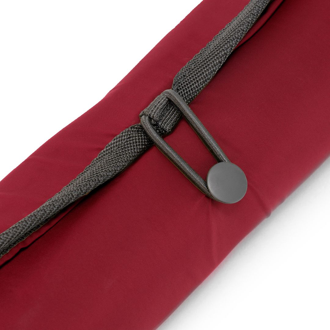 - Tiene un sistema para plegarla en un rollo compacto (goma elástica + botón), para que puedas guardarla fácilmente en tu mochila o bolso hasta volver a usarla.
