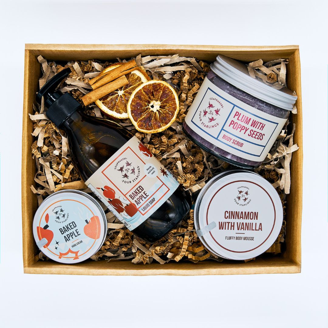 Disfruta de un ritual completo con nuestra selección eco-friendly: crema de manos «Manzana Asada», exfoliante corporal «Ciruela y Semillas de Amapola», gel de ducha «Manzana Asada» y mousse corporal «Canela & Vainilla». Todas fórmulas naturales, sin siliconas, sin perfumes sintéticos, veganas y con aromas cálidos que evocan el invierno. Nutre, exfolia, lava e hidrata con conciencia ambiental.