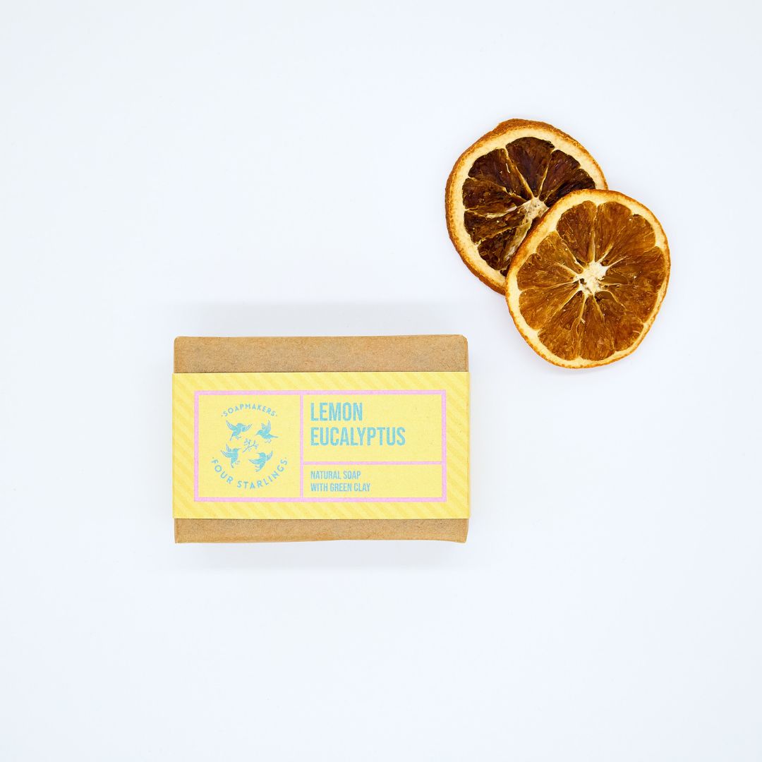 • Jabón corporal «Limón y Eucalipto»: Barra vegetal con aceites de coco, oliva, ricino y manteca de karité, arcilla verde y aceites esenciales tonificantes. Limpia, nutre y despierta tus sentidos. (El Gramo Original)